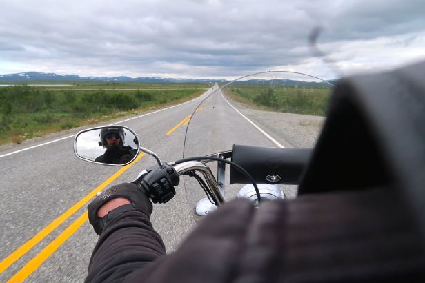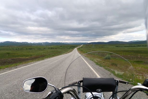 We finally arrived back at the Harley about six hours after leaving it. However, to do that we did not stop at all, except for the last part, when we really had to, because we were both so tired. We had kicked about a million rocks and, even though we had hiking boots, our feet were sore. I really pitied those Russians who were still not visible, even in the far distance. At some point, about half way back on the trek, we had realised that getting back to the Harley was not the only problem we had. The restaurants in Norway usually close at ten. It was pretty clear that we could not get to one anyway, because we still over twenty kilometres from the town. But, we were parked just six kilometres from the Nordkapp complex. We decided that, despite complete exhaustion, we would go there immediately so that we did not have to come back the next day.