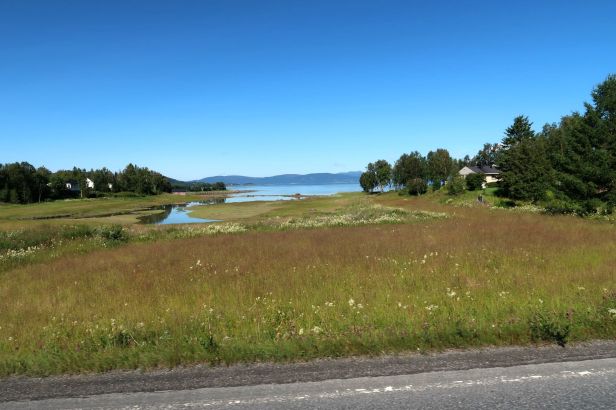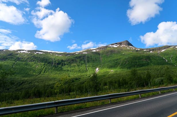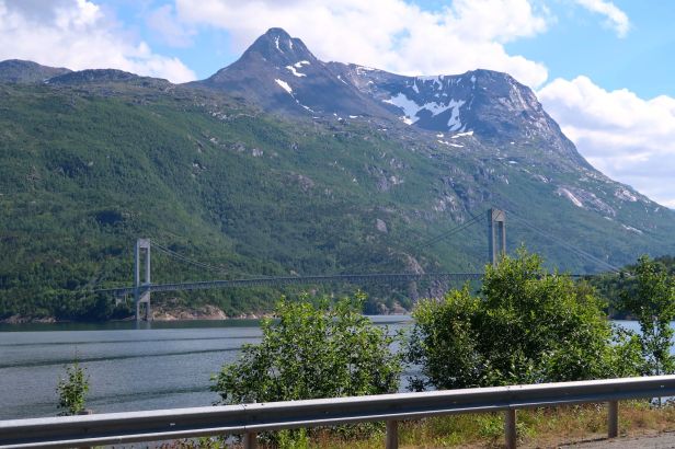 As was to persist throughout our trip, the road was great. It was smooth and well maintained and the views in every direction were stunningly beautiful. The landscape between Ballangen, Narvik and Alta had a very special grandeur indeed. There were sea views below us and, above us, mountains and hills with snow still visible here and there. There were waterfalls to look at and lakes, rivers and lagoons at every turn. Some of the combinations of mountains, sparkling water, green pastures and neat houses looked like stylised paintings.