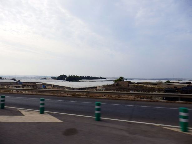 The entire region that we were then riding through was devoted to horticulture. This was primarily the production of tomatoes on a vast scale. These are predominantly grown in ugly, tatty “greenhouses“. There is no glass, they comprise flimsy steel frames supporting acres of plastic sheeting. A large proportion of this plastic has been torn by the seemingly incessant winds and flaps loudly enough to be heard even on a passing motorcycle. South of Almería, this unsightly mess stretches all the way along the costal plain as far as the eye can see.