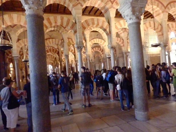 Cordoba’s principal monument, the Mezquita, was surprisingly easy to find. Even so, I somehow managed to spend about fifteen minutes in a completely wrong line for tickets. Luckily one of us spoke some Spanish. We found the right queue, bought tickets and went inside. It was originally a mosque, which was initially left in its original state after being converted to be a Catholic cathedral (Mezquita even means Mosque in Spanish). Then, in the 16th century, King Carlos I allowed it to be substantially remodelled internally. This involved some demolition and the building of the grandiose main altar and nave. It is certainly something to see.