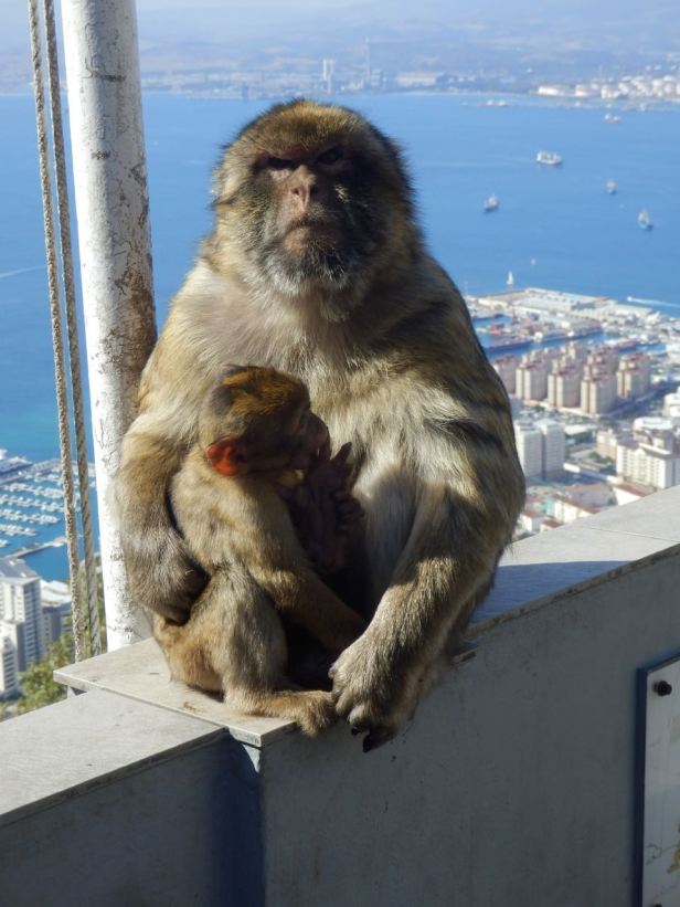 In the meantime, the cable car queue had disappeared completely, so we went straight to the cabin and up to the top. During the ascent, there was an audio warning that the Barbary Apes, Gibraltar’s iconic, simian residents, were very prone to steal rucksacks and handbags and make off with them across the precipitous rocks. Lucie told me that I was, on no account, to let some ape either jump on her back or make off with her belongings !