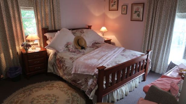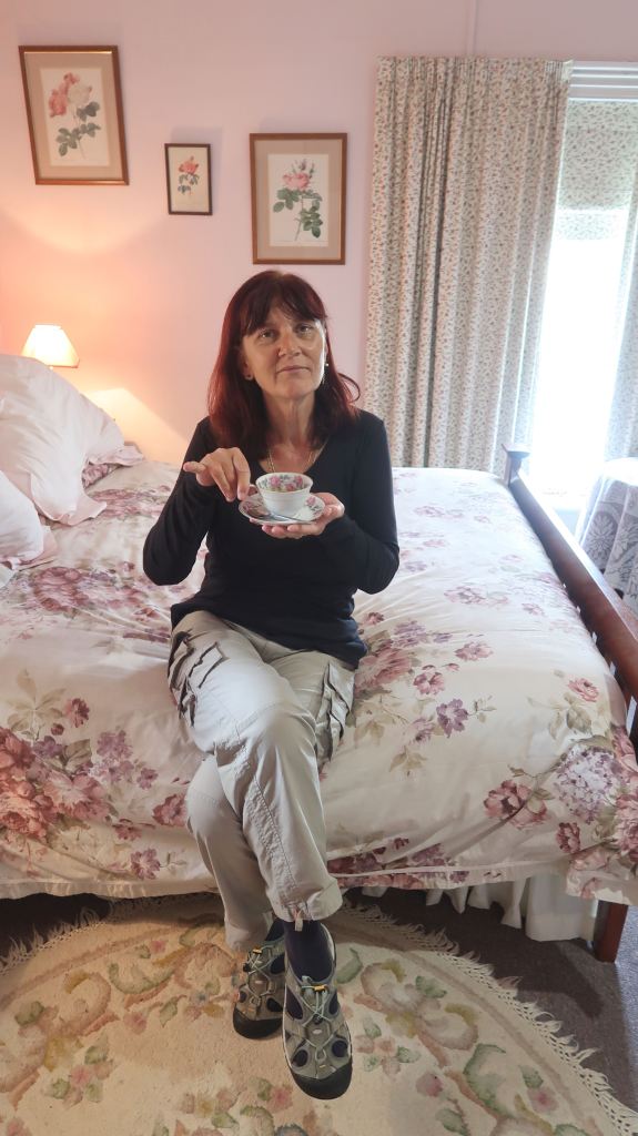 There followed what was actually quite a nice conversation. Despite her slightly fierce aspect the lady was quite friendly. Finally we retraced some of our steps and went up the stairs in the room of portraits to our room. The old woman’s cane was tapping in front of me as she slowly climbed and I was a little nervous that it might be her last trip. Our room completely encapsulated the style of the whole house. The metal framed bed was made up so high that I doubted that under the bedspreads, pillows, dolls and a straw hat we would ever find some bottom layer suitable for sleeping. The bathroom was surprisingly completely contemporary but an ornate washing jug and bowl sat on a table. Just in case, I supposed. There was a fridge containing water, milk, butter and yoghurts for breakfast and a toaster, with bread on the top. A good selection of teas and coffees was by the kettle and the “Olde Worlde” air was topped of by a pair of crystal decanters containing port and sherry and small, matching, crystal glasses. Instead of a wardrobe, a hanging rail with hangers, each with its own crocheted or fabric cover stood in the corner.