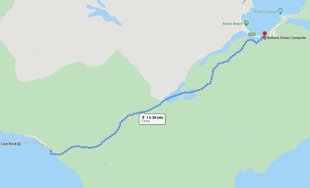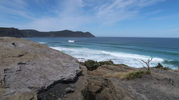 But finally, we did reach the coast, which had been audible long before it was visible. Our reward was an incredible panoramic view across a spectacular and wild bay. The sea was a perfect blue. This belied the obvious power of the huge rolling waves that crashed against the rocks and slowly dissipated their power on a long strand of flawless golden sand. To our right was a small, craggy island, known as Lion Rock and, to our left, the South East Cape.