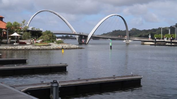 Close to the hotel was a swanky marina, still in the final stages of development. We walked over a pair of elegant bridges to a walkway along the banks of the Swan river that was fringed, in places, by modernistic carvings and statues.