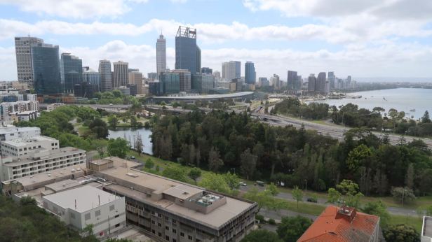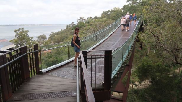 There was scarcely any traffic at all as it was a Sunday morning. Using the well laid out paths we navigated our way through the greenery to the foot of a large bluff that overlooks the city. The almost sub-tropical climate meant that the vegetation was quite lush and there were green trees and glossy-leaved shrubs everywhere. We knew from our old “golfing” friends, Richard and Heather, that Perth had an impressive Botanical Garden which was on the top of the bluff. There were gentle paths upwards, but we climbed an impressive modern steel staircase, known locally as Jacob’s Ladder. At the top of its 242 steps, which were also thronged with earnest young athletes just climbing and descending as their morning exercise, was a viewing point that made the climb well worthwhile.