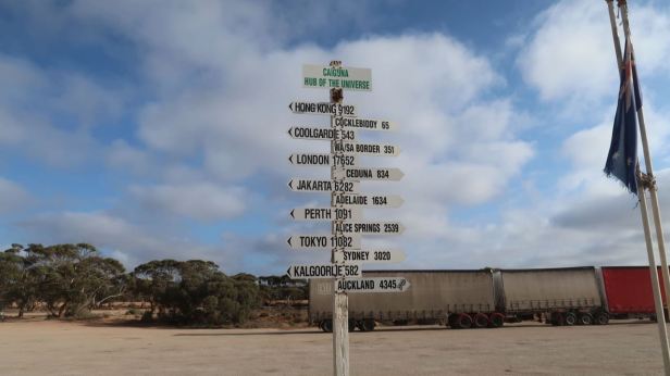 There was one of those cheerful omnidirectional signs, by the pumps, informing us that we were 2,539 kilometres from Alice Springs – and that it was still 1.091 kilometres to Perth.