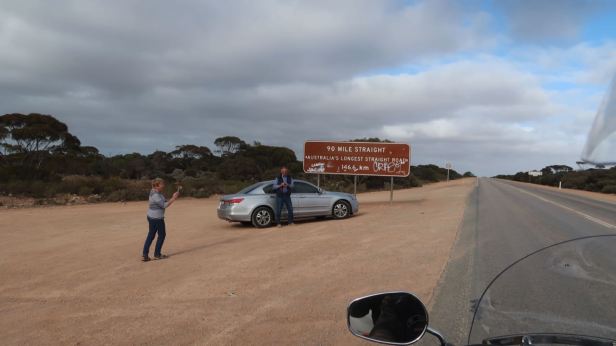 Richard and Heather left before we did, but we refused to say goodbye to them because we were sure we would see each other in Norseman, if not before, Although they had left first, we caught up to them almost immediately because they had stopped, as we did ourselves, in front of another significant road sign. This gleefully informed us all that we had arrived at the start of the longest completely straight section of road in all Australia, “the 90 Mile Straight” (147 kilometres). We also captured them in a photo there.