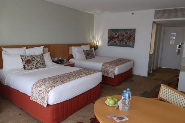 The Sails in the Desert is a seriously big hotel. It is open plan, criss-crossed by shrub fringed paths and only two storey, so as not to impede sight lines. It occupies a huge area. We rode around to the side, so as to be nearer our room and we still had to drag our bags about 500 metres. Our room was stunningly luxurious by any standard, let alone compared to our previous night’s cabin in Marla and we really appreciated the sophisticated air-conditioning.