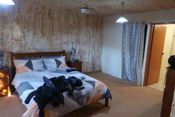 There had been no need to use Mapy since Port Augusta, there was one road and nowhere else to go. As we came to the outskirts of Coober Pedy proper, Lucie turned it on to help find the way to our accommodation. Paved road quickly turned to a dirt track that looked more like the entrance to a quarry than anything else. I really felt this was no place to be on a heavy, touring motorcycle. I considered turning back, but then I saw a sign for Jam B&B which was where we wanted to go. There was no sign of it though, as I manoeuvred gingerly around heaps of sand and some rusty mining machines on the loose surface of the track. Through the intercom, Lucie informed me that she really thought that this was a big mistake. There are the well-established stereotypes for B&B location and this was surely not one of them.