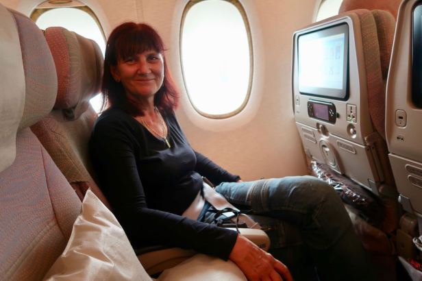Fortunately, the first Emirates flight to Dubai was almost comfortable because there was a free seat next to us, so we stretched out in a row for six hours. The food was good (!!) and the in-flight entertainment was excellent. We each saw two movies, even though Lucie fell asleep.