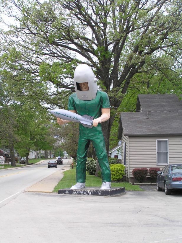 I had not had any lunch and just as hunger began to make itself apparent, up ahead, I spotted a huge green figure dressed in “astronaut” style (but think “The Jetsons” not Apollo 16). It seemed that I had arrived at one of the Route’s sites, the Launching Pad Drive-In (810 E Baltimore St, Wilmington, IL 60481). I stopped and helped myself to a burger and fries and, for the first time, experienced the full horror of American portion sizes. It was a rule in our house, when I was growing up that, if you put it on your plate you had to eat it. So I did, but I was full to the brim before I got halfway through.