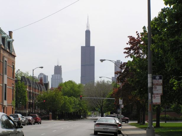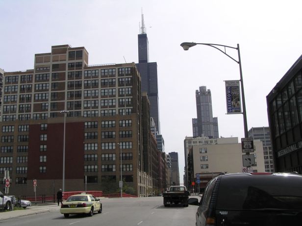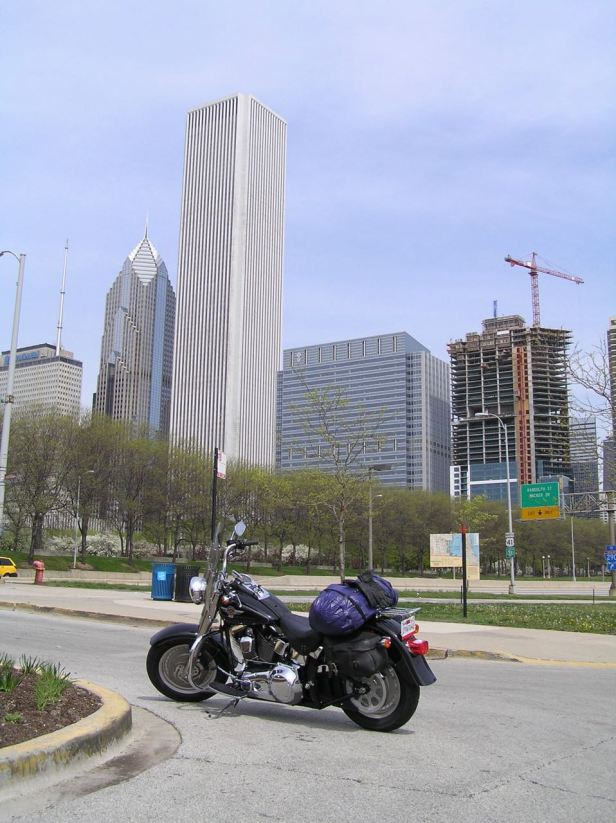 Because of its imposing height, the Sears Tower (233 S Wacker Drive, Chicago, Il 60606) was clearly visible, but getting close to it proved problematic and it was quite some time before I managed to park near to its base. I took what seemed to be the overly rapid lift to the SkyDeck, a rather alarming glass floored lookout point 103 floors and over 1350 feet above the city. It was my intention to take a picture of the bike from the top, but I simply could not pick it out ! The view of the city and nearby Lake Michigan was a bit hazy – but spectacular nonetheless.