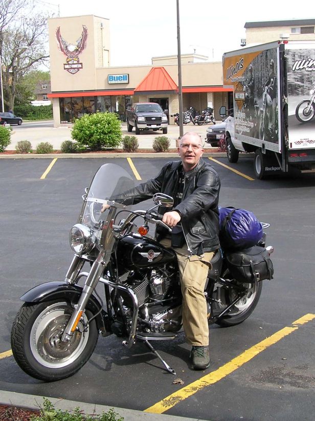 I ate a quick and slightly weird (as I was to find) breakfast and waved goodbye to the Day’s Inn. Then I ambled the couple of miles to Touhy Avenue and the Eagle Riders shop (419 W Touhy Ave, Des Plaines, IL 60018). The route, which cut through the urban wasteland of the northern airport environs was, like most of America, not designed for people who walk and a bit tricky in places. Even after walking for over 40 minutes, I was still there way too early and had to wait, sitting on a low wall, for the staff to arrive.