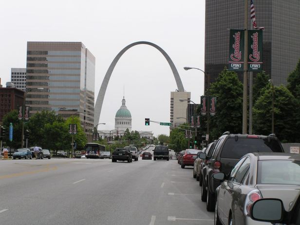 There is nothing like getting your first error of the day out of the way – and I duly did. The Chain of Rocks road I was on helpfully led to a Chain of Rocks Bridge but, sadly, not THE Chain of Rocks Bridge. Before I really realised what was happening, I was crossing the Mississippi and, simultaneously, from Illinois into Missouri on a newish highway bridge that had replaced the original. As I was on the right hand side, with several busy lanes of traffic going in two directions to my left, the bridge of legend, about half a mile downstream escaped my notice entirely. By the time I was able to stop and, at least, try to reorient myself, I was already some distance into St Louis. I tried to go around in order to go back for a look, but somehow found myself lost in the maze of streets that started as soon as I left the freeway. With no sun to even give me a hint as to which direction I was heading, I blundered around for a while before locating a bigger road. Keeping the marginally lighter sky, where I hoped the sun was hiding, on my left, I then presumably went south, but, despite its size I was unable to locate the Mississippi.