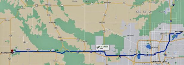 These took me through Oklahoma City and away to the west, often paralleling the trusty old I-40. This was actually quite a significant stretch of the old road. Sadly, because of the proximity of the Interstate, most of the commercial stuff you need as a traveller, motels, restaurants, etc., were on the newer road and, by virtue of fencing, totally inaccessible. Finally, at the town of Weatherford, all the Routes 40/66 and I-40 seemed to come almost together and I saw, not far from the road, the welcoming sign of a Travel Inn (3401 E Main St, Weatherford, OK 73096). It was a tiny bit “low rent”, but it had vacancies, so I checked in. I had actually come over three hundred miles by then and I was fairly tired. I was also fairly hungry. The guy on reception directed me to a nearby diner, Lucille’s Roadhouse Diner (1301 N Airport Rd, Weatherford, OK 73096) which was only about half a mile away, so I surprised him by walking there. Pleasingly decorated with Route 66 signage, this place offered standard diner style cuisine. I chose a burger and got the kind of burger only Americans can make. It was totally delicious and did not require the huge amount of fries that inevitably accompanied it. Again, I could not finish them.