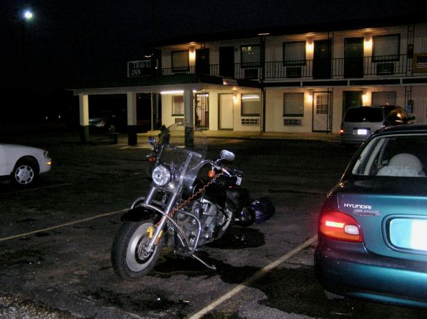 At the risk of sounding casual about the next ten seconds or so, all I can say is that the experience gained from over a million miles of riding somehow prevented a disaster. In retrospect, I do not really remember getting vertical, locking my arms and closing the throttle, but I must have instinctively done all those things correctly. Suffice it to say that I somehow coasted to a controlled stop about one hundred and fifty yards down the road. Suffice it also to say that, having stopped safely, my heart was in my mouth and I was shaking like a leaf in a gale. It was many long minutes before I gingerly set off again. It was very difficult riding, the stones slid everywhere at the first hint of acceleration and, for the first time, I could fully appreciate just how heavy the Harley was. After a couple of miles, the road surface returned. I had seen no warning signs at the first end and there were certainly none at the far one. Perhaps people in south-east Kansas hate bikers ….