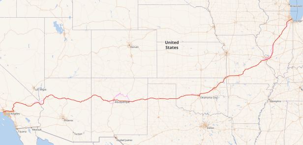 I have tried, in retrospect, to use Google Maps to show where I went. Sadly, there is no way that that program can be persuaded to illustrate it accurately. The daily start and finish points are accurate – but on the big maps, more illustrative than completely accurate. In the more localised ones, particularly between Oklahoma and California, they are more accurate, but please do not take them as gospel. If you decide to go yourself, do what I really failed to do myself, some prior research !!
