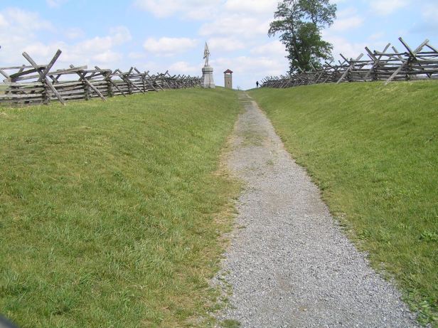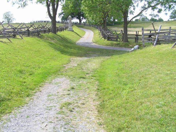 A short distance further south, is the infamous “Sunken Road” where Confederate troops lay in the shallow depression caused by wheeled traffic and repelled wave after wave of Union assaults. By the time they were finally overwhelmed and driven back, they had left well over five hundred of their foes dead. Apart from a monument, the road, flanked by a rail fence, looks almost exactly as it did in Brady’s pictures. The scores of bodies, images of which are said to have shocked America, are gone – but otherwise the photo could have been taken the previous day.