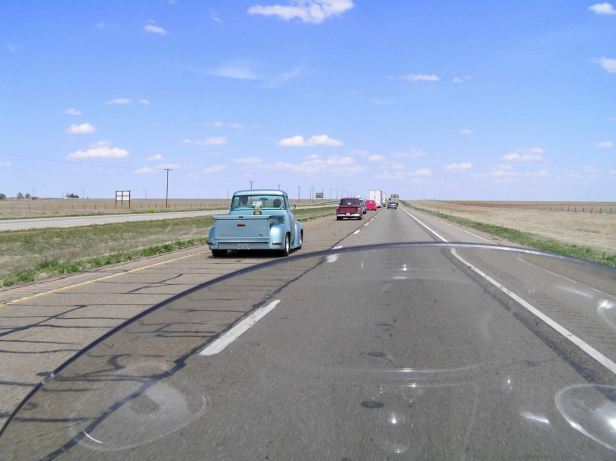 It was still quite blustery, but not as bad as the previous day. I had mentally resolved that, as I had quite a way to go if I wanted to get to Memphis, I needed to press on a bit. I decided there was no way I was going to stop before I got to Oklahoma City which was over one hundred miles away. I rode on, still through half familiar territory and, about an hour and a half after I started, a Ford F100 appeared in my mirrors. It was the red and white one that I had been parked next to all the previous night.