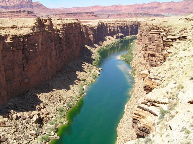Route 64 was called the “Desert View Drive” and that was about right. It initially followed the dry, dusty top of the gorge, with the Little Colorado river winding through quite verdant greenery, far below. Then, as it came to the eastern extremity of the Grand Canyon itself, it wound, quite tortuously in places, along the rim of the gigantic depression. So deep was the canyon, that the Colorado River, which had, by then, been augmented by the Little Colorado, was scarcely visible. Every view point was absolutely crammed with people and vehicles. I had to wonder how some of the huge recreational vehicles had made some of the turns on the road.