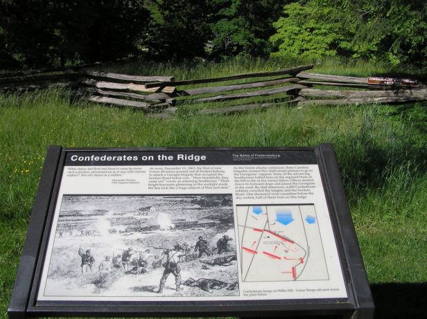We carried on to Fredericksburg and, as we entered the town, Route 3 was billed as “The Blue and Gray Highway” as a homage to what took place there. In mid-December, 1862, Union troops under General Burnside managed to bridge the Rappahannock with pontoons despite being under constant artillery and rifle fire. Return artillery fire from Union forces almost completely destroyed the town. Having crossed, the 120,000 Union troops first looted the ruins and were then ordered to assault the Confederates on the Maryse Heights above the town. On December 13, 1862, General Burnside thought he would surprise the Confederates by attacking them head-on up the slope. Although the Confederates were heavily outnumbered, they had less than 85,000 troops, they were very ready for the frontal attack and the Union soldiers were mowed down by Confederate fire. By the end of the day the Union had suffered so many losses (12,653), they were forced to retreat. Confederate losses were 5,377. No doubt prepared by a Southerner, the informative signs reports almost gleefully that the battle signalled the low-point of the war for the Union. General Burnside was relieved of his command shortly afterwards and the signs also quote Robert E. Lee as saying “It is well that war is so terrible, or we should grow too fond of it.“.