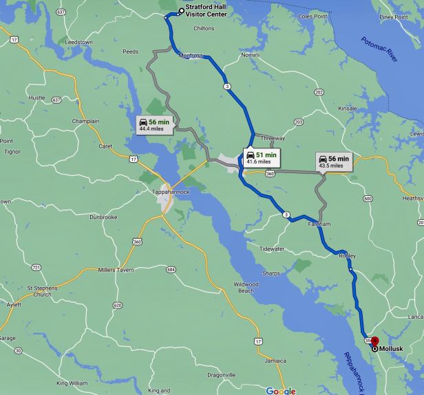 I arrived back on the floor of the valley and felt almost affectionate towards Staunton as I drove back through it and, because time was running, took the I-64 east towards Charlottesville and Richmond. I circumnavigated the former capital of the Confederacy to its north on the I-295 but resisted, principally for reasons of time, to follow that all the way to the battlefield of Mechanicsville. I chose instead to branch east onto Route 627 and then to join Route 360 which took me northeast to Tappahannock. At Tappahannock, I crossed the Rappahannock River with considerably more despatch than poor Union General McClellan in 1862, but in fairness, he did not have the same elegant bridge that I did. This put me onto the Northern Neck and in the town of Warsaw (which, naturally made me smile as it was like being at home) I forsook the Route 360 for Route 3 which took me al the way to Lively where I was to meet my friend. As I approached Lively, a bright red Toyota sports car came up behind me, tooting furiously. I slowed to let it pass, but instead it sat right on my tail, flashing its lights and tooting loudly. I pulled over, thinking something must be amiss, only to discover, when I did, that the driver was my friend who had decided, in true U,S. Navy tradition, to “ambush” me !