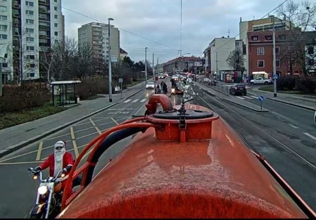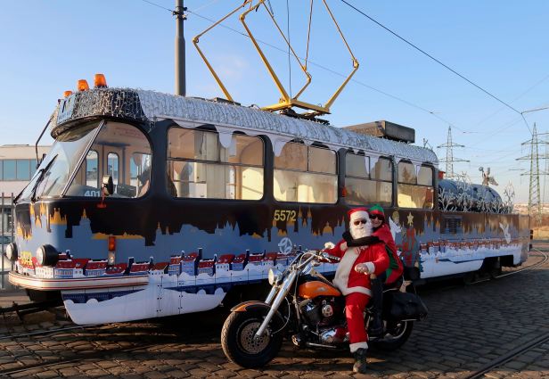 A thought occurred and just before Christmas, aided by my computer literate friend Paul (Lucie had politely declined my pleas) to take screenshots, I donned my Father Christmas outfit and set out after the tram. Of course, this was far from being as simple as I had imagined. It was very hard to keep up with the tram and the traffic regulations for it are different. Every time I got near and was trying to manoeuvre into shot, I had to stop at a traffic light and it was gone again. I chased it for about two hours ! My life was further complicated by continuous requests from pedestrians, not ALL of them with little children, for pictures and “selfies“, I must have done at least fifty !