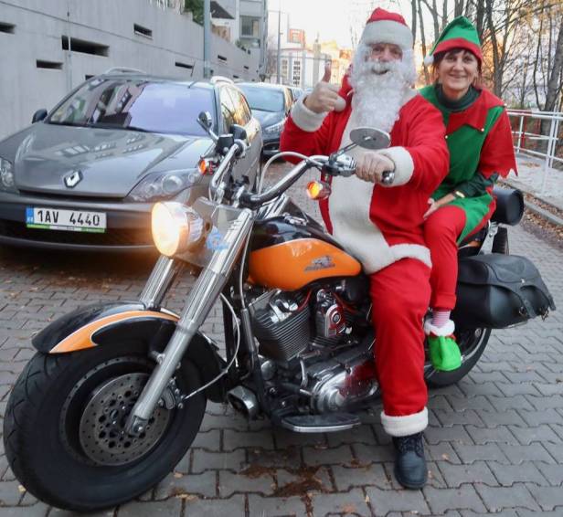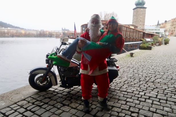 But, we needed a Christmas photo. So one cold and dull Sunday morning we rode down to the Vltava river and put on our costumes. Fortunately, Rod, one of our friends was riding his bicycle along the river bank and was able to take a “socially distanced” photograph !
