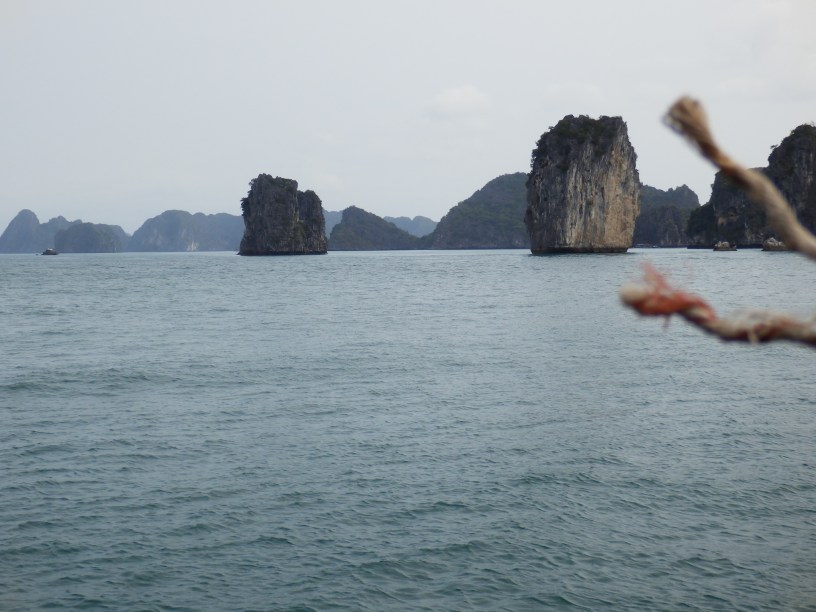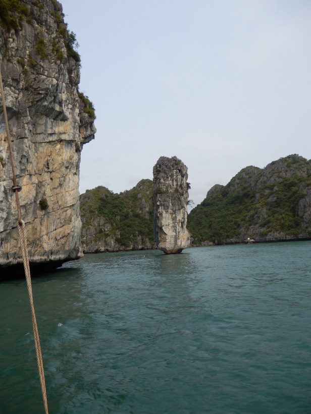 The scenery was stunning. In total the whole bay has almost two thousand islets. These are very high outcrops formed of a type of sedimentary limestone called Karst. Over millions of years, they have been slowly eroded, by the action of the sea, into fantastic shapes. Some of them have spectacular caves, one of which we sailed right into and there are various, twisting, canals between high canyons.