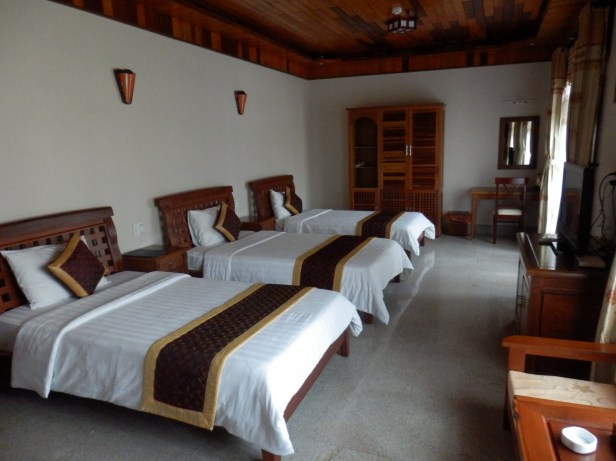 It was soon apparent that we should have prevailed upon our guide to take us straight to the resort. It was not signposted at all and, although Lonely Planet said it was there, it would have saved us a lot of nervousness if there had been some other indication of this. We did know for sure that there was a hotel somewhere and that it was open, but it was not until we came out through the trees and saw it with our own eyes that we truly believed. We were not too worried, given how impossible it was to find, that it would be full – and it was not. By the standards of everything that we had so far seen in Vietnam, the hotel was stupendously luxurious. It was situated right on the beach and surrounded by literally acres of paved walkways and patios interspersed with spectacular flowering plants. It was totally surreal. The receptionist seemed almost apologetic to relieve us of 240,000 Dong for our night’s stay. By local standards, that was an astronomic amount and probably ten times what we had been paying. That said, the 240 Czech Crowns which it was equivalent to, would not even have got you a small beer in a similar style hotel in Prague.