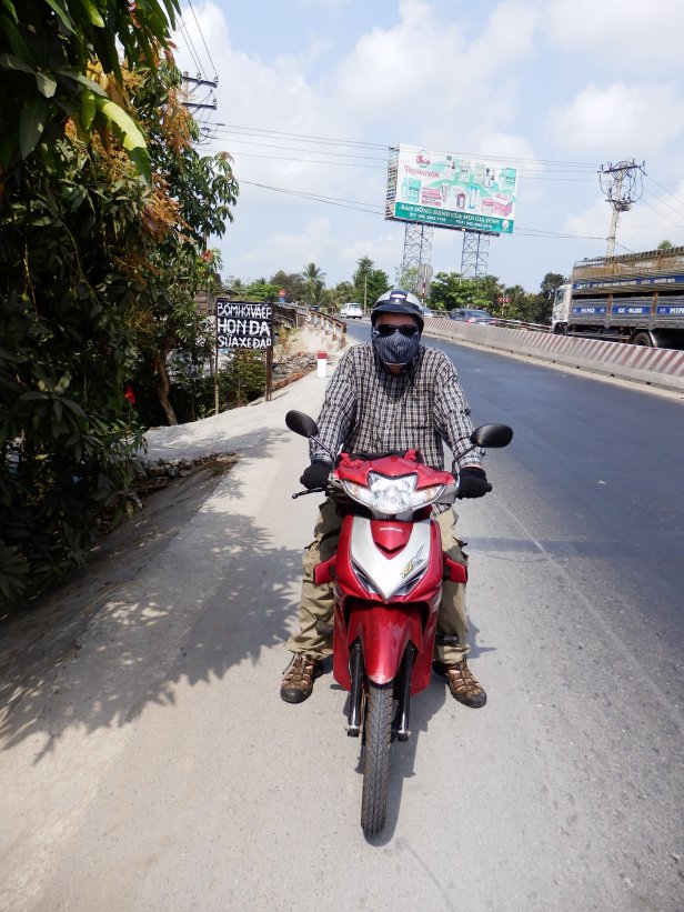 The journey continued without any other major experiences. We drove on the A1 motorway, where motorcycles were still allowed without any problems. We also easily located the necessary detour along the “old” motorway when we came to the new part of the A1 where motorcycles were forbidden. On such a little motorbike, it did take a long time to get anywhere and we had to take a couple of coffee-break stops before we finally came to the outskirts of Saigon. I took my, by then, customary recline in a hammock. David was still suffering quite a bit with his bruises. He was uncharacteristically quiet and lurked on a chair.