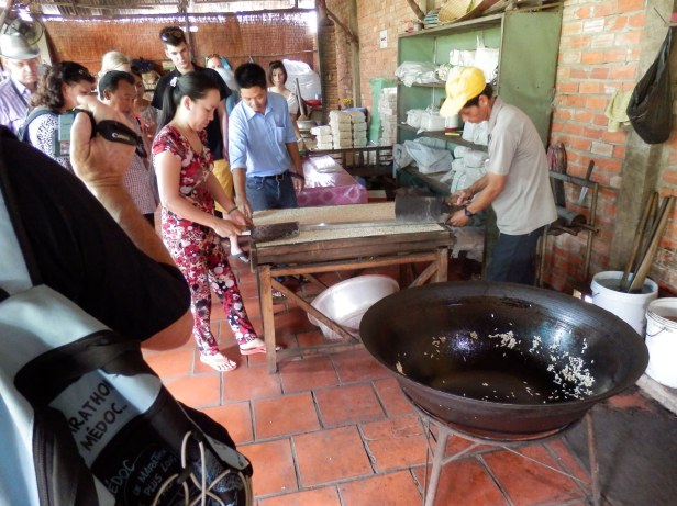 Quite naturally, our boatman trailed us round a number of slightly clichéd locations. In one place, rice popcorn was being prepared on a fire of rice husks, simply everything is used more than once. As usual, I took part in the “practical”, which meant that I got to try the sweets !