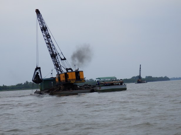 The shallowness of the waterways was clearly visible as we drove past an excavator dredging mud from the water in the very middle of the main channel. We did not know if this was just to keep the depth or if they were digging up fertile mud to improve the soil. Maybe it was both.