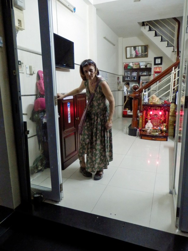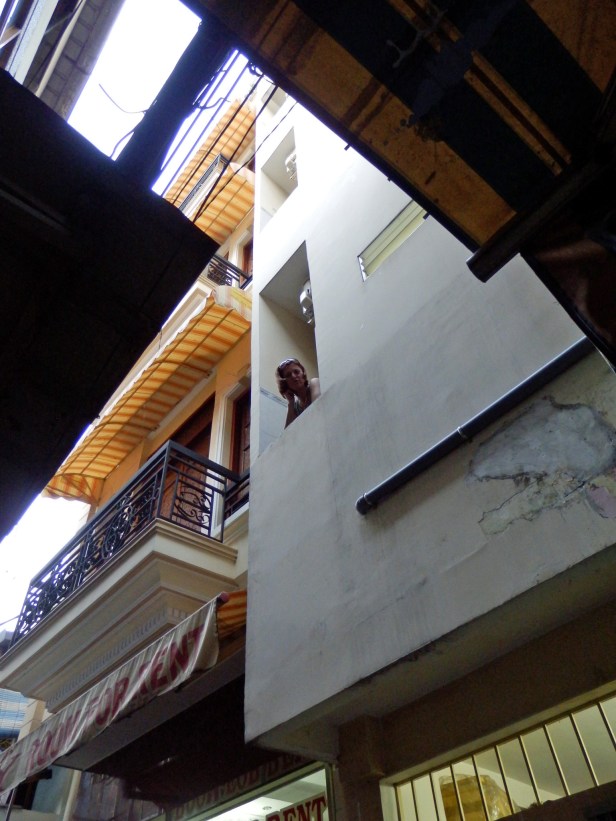 Our room was a small “all-in-one” layout, containing a quite narrow bed, a non-functioning fridge, a toilet and a shower. All within touching distance of almost any point in the room. For our two-member crew, it was a logistical experience. There was also a small balcony. Maybe, we could have both fitted on it if David held his breath and we were standing back to back. But, just in case, if we were going to try that, I would have taken my cell phone with me to call for help if we had become wedged. Or maybe, they could have pushed us from the window of the opposite house – because it was only about thirty centimetres away …. David insisted that he take a picture of me on that balcony, I do not understand exactly why.