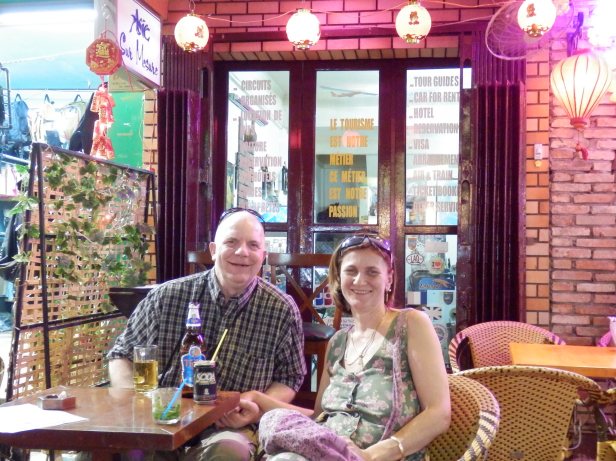 In the evening, we entered the mayhem that is Saigon on foot. It got dark very quickly as we ate a very nice dinner, sitting outside a small restaurant at a table on the pavement. I admit I was ravenously hungry. The food was spicy, in a non-aggressive way and simply delicious. David treated himself to a final beer, he does not drink at all when we are driving and we posed for a “here we are” photo.