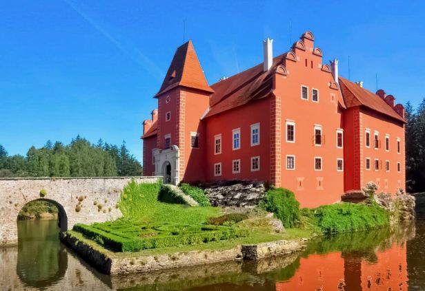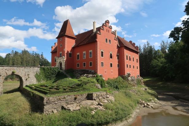 Červená Lhota Castle, (Červená Lhota 1, 378 21) is believed to have started life as a fortress, probably in the 14th century. It sits on a small island in a lake but, after fires and remodelling in the 16th century, became more of a country mansion than a castle proper. It is in Renaissance style and the exterior walls are covered in red plaster. It is this that gives it its name, Červená is the Czech word for red. I had visited it in 1994 and been entranced by the sight of the castle reflected in the placid green lake.