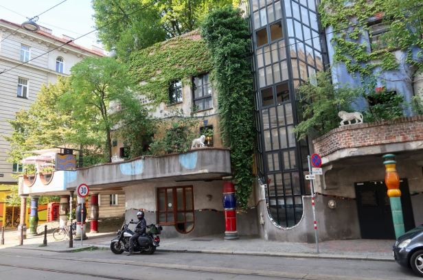 The motorway signs indicated that it was about two hundred kilometres to Vienna, which meant a couple of hours to the Austrian capital. The information displayed upon our eccentric SatNav however indicated it was much further away and the ride time would be much longer. Sadly, more interesting as the SatNav’s plan might have been, we could not really afford the time its, no-doubt, more convoluted suggestions would have taken up. A little sadly, perhaps, we opted for a drone up the motorway which, within a few kilometres, was wider and also designated as the E59. The Softail is very economical, particularly at the speeds we tend to ride it at in order to take in the scenery, even on the motorway, but now a little pump on the display let me know it was finally thirsty. We stopped for petrol and a coffee at a service area where they happily supplied us with petrol that was 60 Euro Cents a litre more expensive than in the countryside. Ho hum ! I took the opportunity to contact our friends and found they had been delayed in their chores and that, suddenly, we had a bit of spare time. On our list we had three Hundertwasser sites still to see and two of them were almost next door to each other in Vienna’s Landstraße district. Our intention had been to do those on the upcoming Sunday morning, but now we had an opportunity to do two of them straight away. I adjusted the SatNav and we headed for the centre of the city.