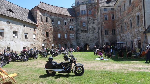 We soon came to a point in the countryside where there seemed to be a lot of Harleys in “milling about” mode. We found out that part of what was the only obvious route had just been closed for a bicycle road race event !!! I suppose that there was no possible way Martin could have known this, it was a “local” thing after all, but, when we pulled up to replan our route, we knew all hope of victory was gone. One of the “early birds”, who had gone through before the road closure, would be grabbing the prize ! Of course we still tried, who knew if ALL of those who had made it through would not make some catastrophic mistake, but we became far more relaxed about it. It was a nice day and, after a distance killing detour, we rejoined our planned route and enjoyed the rest of our ride around the specified points. This included the “Stop Point” noted at number 3 on the roadbook, the courtyard of the Zámek (stately home/ruin) in Rožmitál. Refreshments were on offer and we all relaxed a bit.
