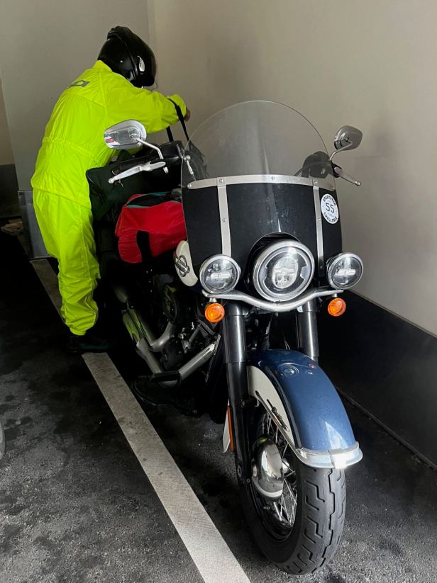 In over half a century of two wheeled fun, I have, of course, ridden quite a distance in the rain. This unceasing deluge called to mind the plains of Illinois on my last day on Route 66, but at least Lucie had not had to endure that. She sat huddled behind me for over five hundred and seventy kilometres. This seemed to be uncomplainingly, but of course our intercom was not working. At our frequent stops for warming drinks, the tension of riding in such conditions where there was really low visibility and a lot of standing water on the carriageway meant I could scarcely stop shaking. What the scenery beside the road was like, I cannot say, I never saw any of it. Neither did Lucie as her visor kept fogging up and she certainly was not about to get out the camera for any snaps.