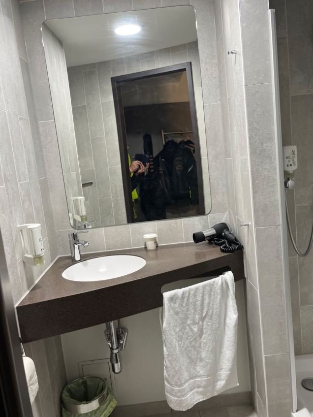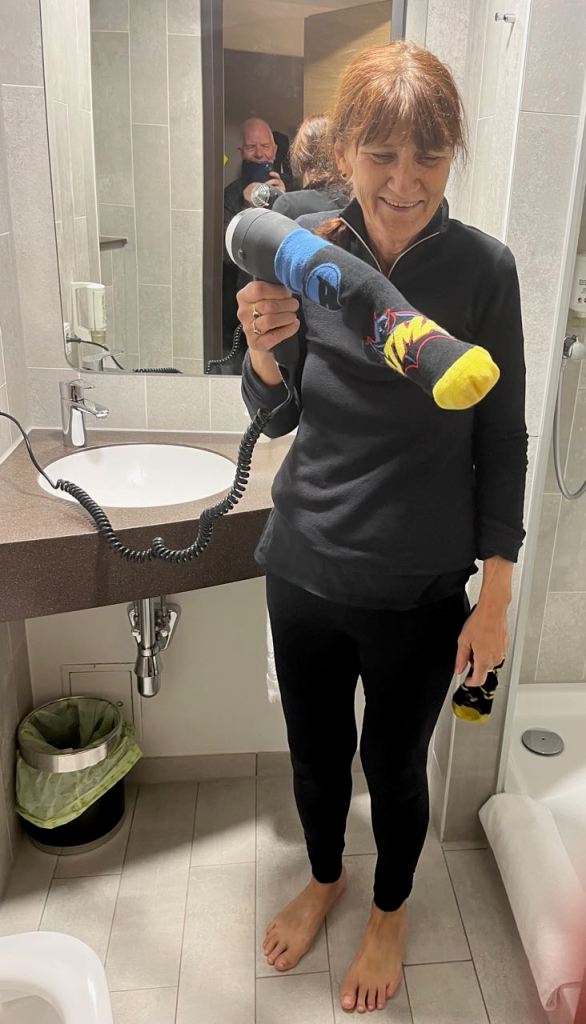 There was also a hairdryer in our bathroom so we were able to perform a lot of the same drying tricks as we had in the Park Inn. In truth, because we had been wearing our waterproofs all day, we were, rather surprisingly, not as totally soaked as we had been the previous evening.