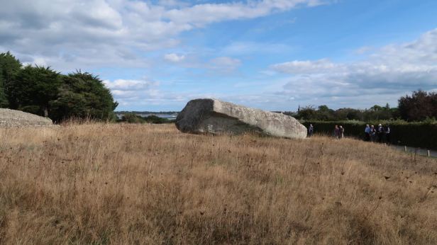 Once across the headland, we came to Locmariaquer. This is the home of the Grande Menhir Brisé d’er Grah (Route de Kerlogonan, 56740 Locmariaquer). When I visited the same site, in the mid-1990s, this was called the “broken megalith“. This name came from the theory, still valid at that time, that the three huge sections remaining had once been a single megalith over twenty metres tall and weighing a startling 280 tons and which had been deliberately toppled. To me, it is almost disappointing that modern technology has now revealed that this was not the case and that it was always four separate stones weighing a mere 70 tons a piece. Science can pretty much spoil a good story. It is worth noting that the brochure still indicates it WAS one single stone …..