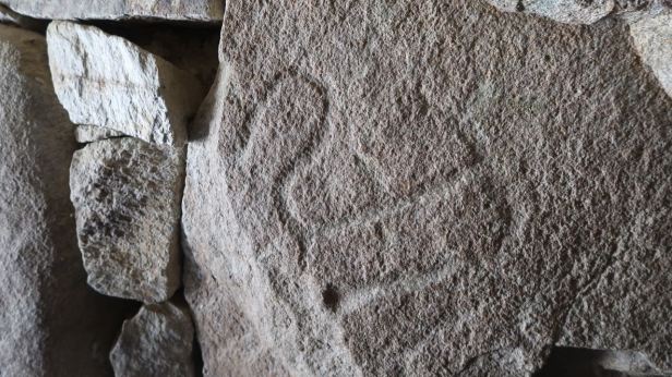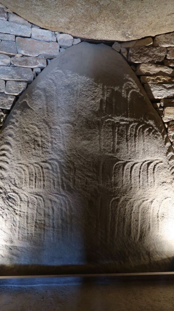 Nearby, in the 1990s was a so called “table grave”. This was a huge slab, balanced (somewhat precariously) on stone legs. This has now been restored to its full neolithic grave format. The slab now forms the internal ceiling and to get under that you need to walk down a narrow gap in the piled stone walls. There are carvings of ornaments, animals and mystic shapes and the place has an almost spiritual air. The lintel at the doorway is a bit low for people of a modern stature though, please do not ask me how I know this !