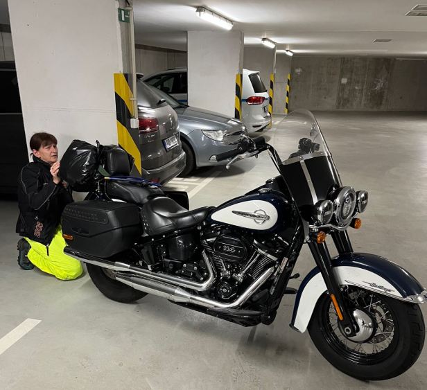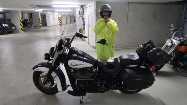 The great day arrived and by a combination of deft time-management and good fortune we were in fact able to leave early in, what was by then, about the ninth version of our plan. But was this good fortune ? Probably not, because although there was not actually a Monsoon happening outside, it was not far away from one. To avoid getting soaked as we packed on the pavement outside our house, we elected to pack everything into Lucie’s SmartCar (a.k.a. “The Bat-mobile” because of its number plate) and head to our garage to load the Harley and to suit up. Hang on. Did I say EVERYTHING ? What I should have said was almost everything ! When we got there, I discovered I had omitted to include my HOG vest. This was critical as, in its pockets were all the motorcycle documents, the keys to the panniers and helmet locks and, of course the alarm immobiliser…….