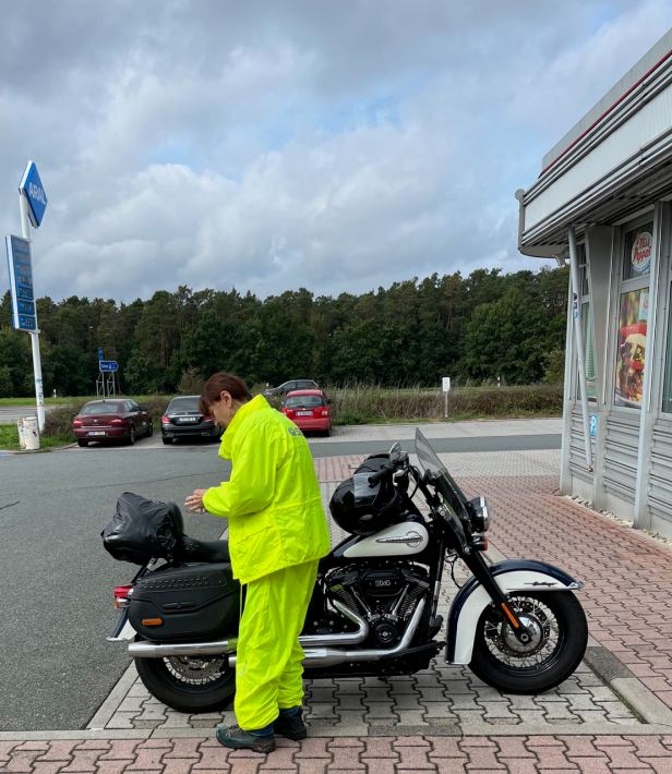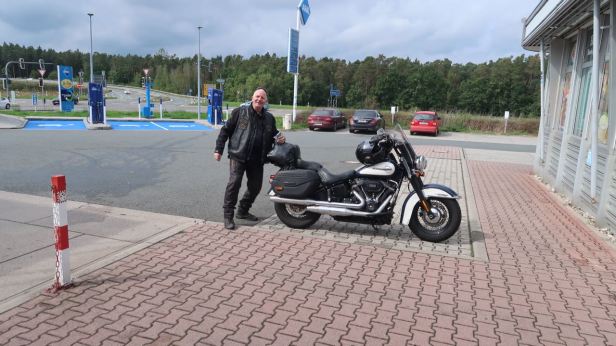 Things were not really going well. It was not raining, but now roadworks began to plague us. Kilometre after kilometre of the autobahn was dug up and often reduced down to a single lane in each direction. German drivers are, almost invariably, orderly and disciplined, so the complete stops were minimal, but progress, with so far still to go, was painfully slow. The Softail has a really good range and, at those lower speeds really quite a long one, but we did need petrol so we stopped for the second time.
