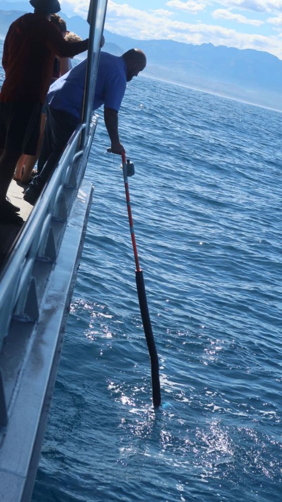 Once out at sea, in what was a “likely” area, the boat stopped and the captain climbed on the stern with a submersible probe, a kind of listening device. They do not use classic sonar because it disturbs the whales. He went from one side to the other for a while and then we were told, via a speaker, that there was a whale about half a mile away – and to grab a hand rail so we could get there quickly before it dived.