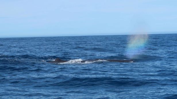 The captain very skillfully positioned us alongside the whale about a hundred metres away. Up close, it was huge and we all lined the rails admiring its size, the geysers of water it “blew” upwards and the rainbow that formed in the air when that happened.