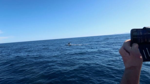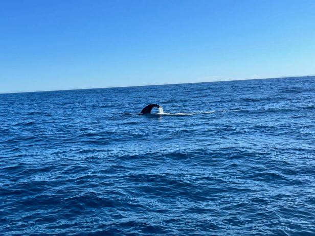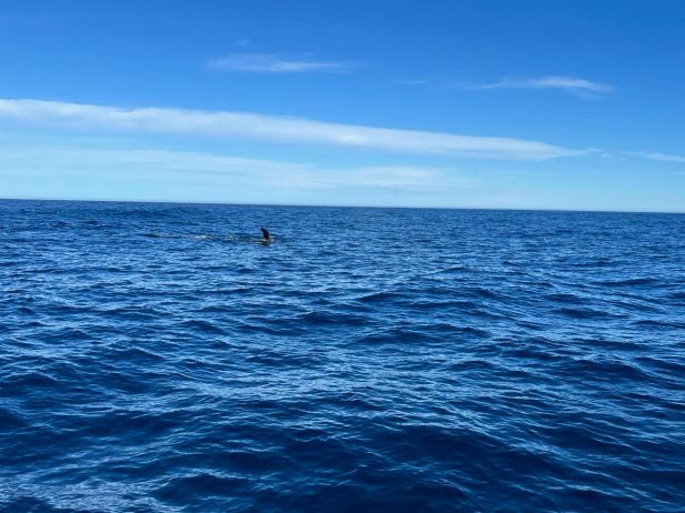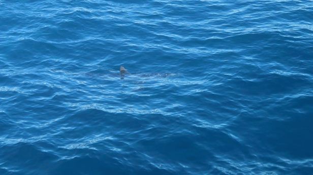 During this observation, a big shark casually swam between us and the whale. In the clear blue water, it could be seen clearly and was really beautiful. Only its classic, menacing dorsal fin broke the surface of the waves.