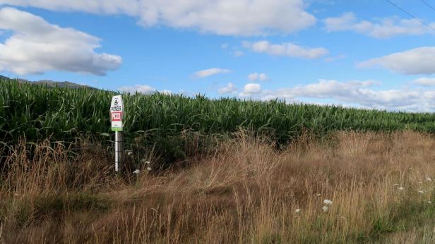 As ever, we made a stop every hour or so which, with our very relaxed rate of progress, was about every eighty kilometres. All over New Zealand, we had encountered vast fields of Maize (or Sweetcorn). Every one of these has a notice stating exactly which “strain” it is growing there.