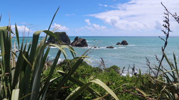 We soon reached the coast, where, in a stunningly beautiful bay, the path to the cliff lookout point started. The bay was so glorious, the name “Cape Foulwind” seemed singularly inappropriate.