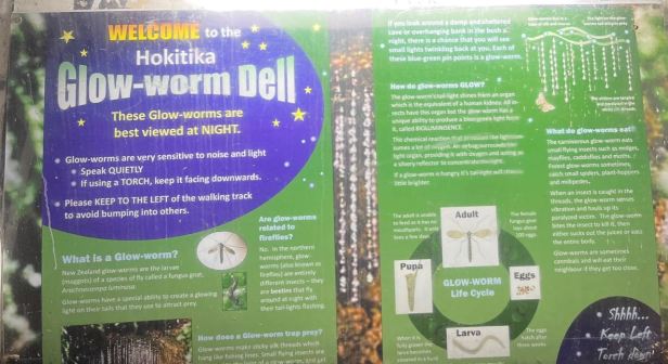 Best of all though, as we turned right from the highway to the motel, the signpost to the Hokitika Glow Worm Dell, the wide cleft in the rocks where the glow worms live, was right beside the road. What Lucie had been referring to as her “Waitomo Caves fiasco” was about to be fixed when it got dark !